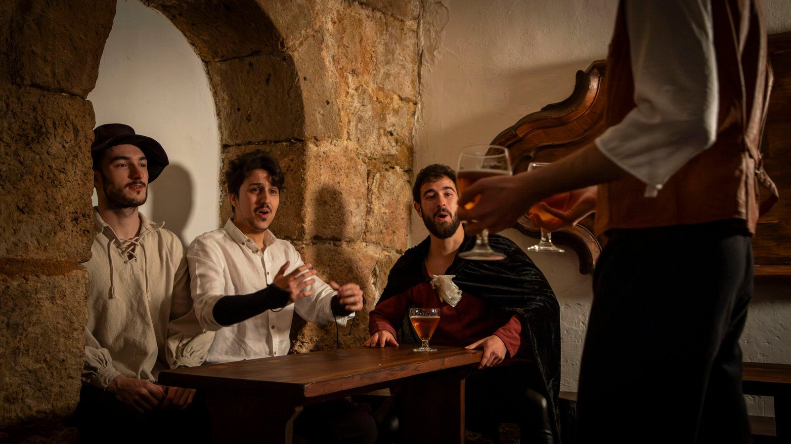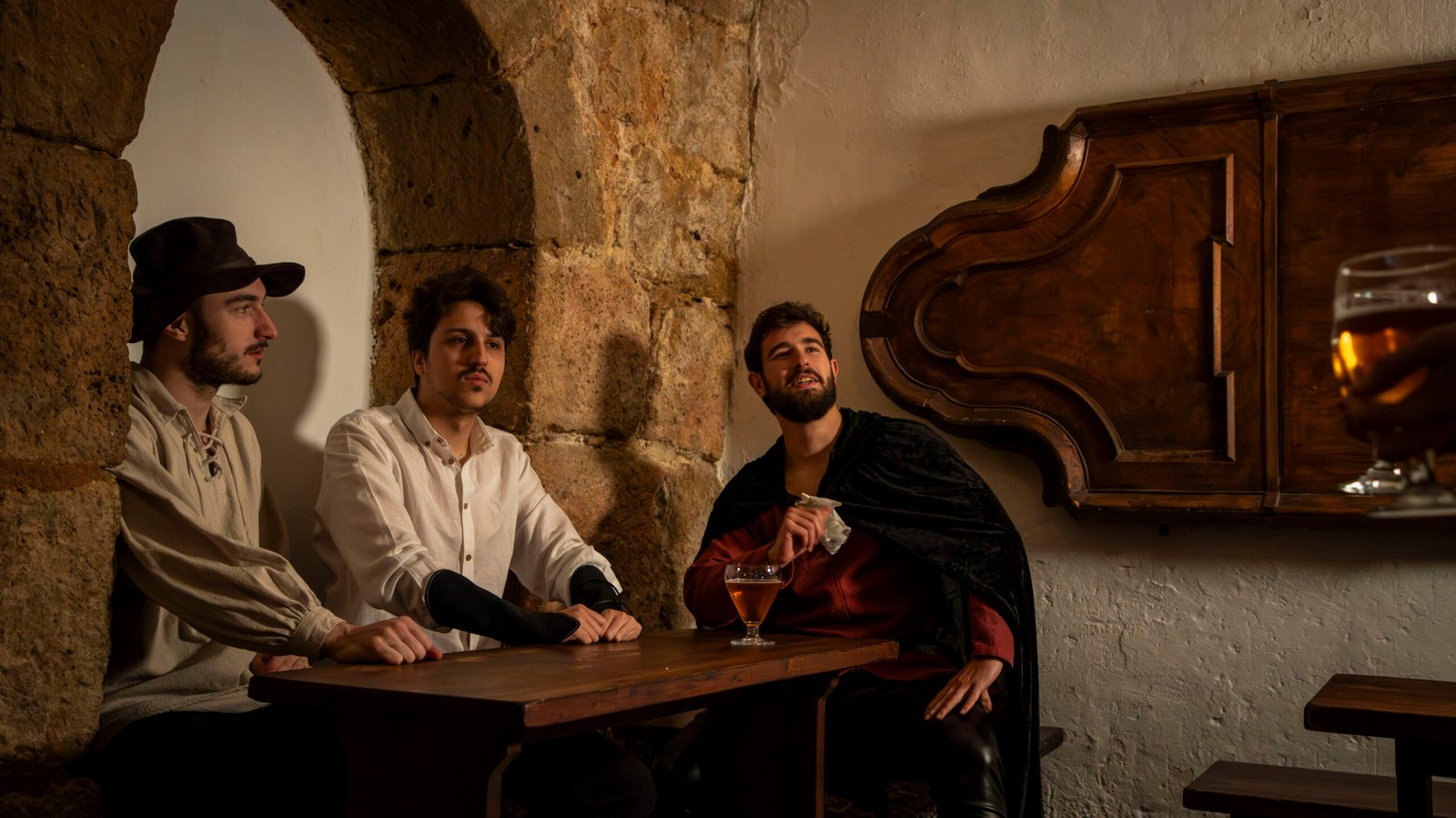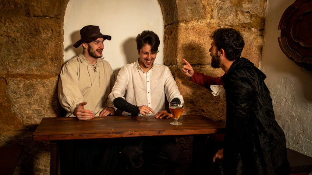 Los murmullos de los habitantes de la ciudad se pierden entre el eco de risas y cánticos en esta taberna, un refugio temporal para aquellos que desafían los temores que trae consigo esta noche.
