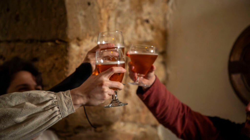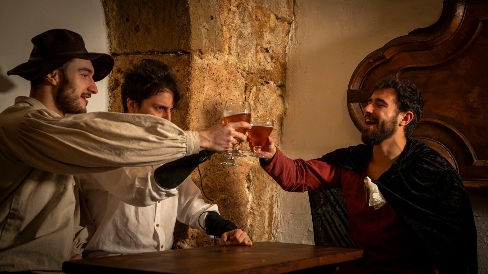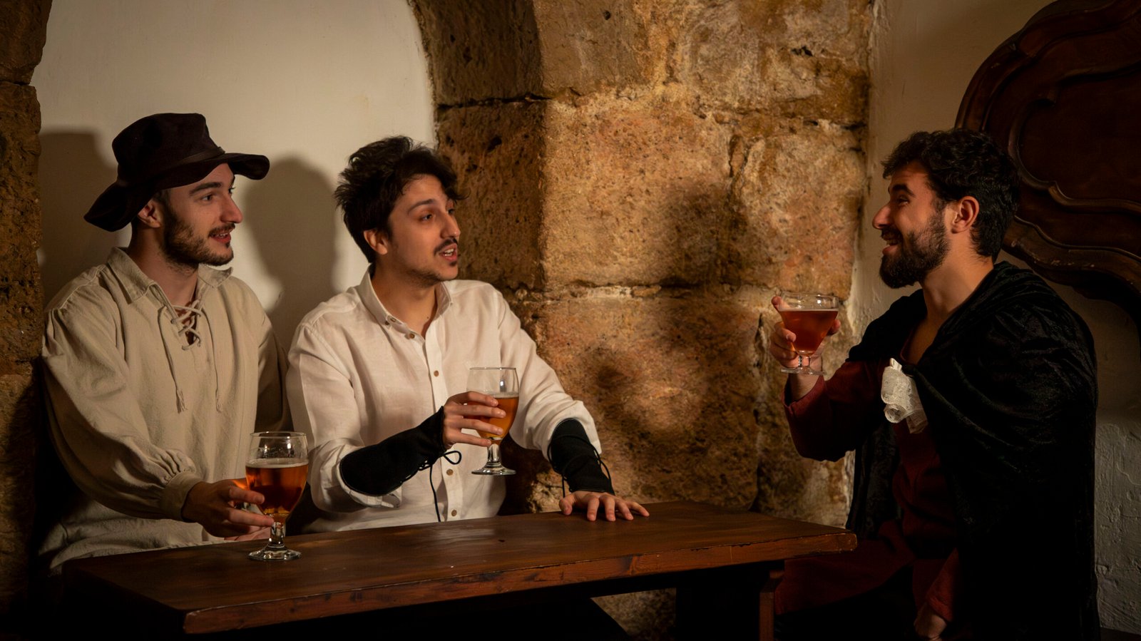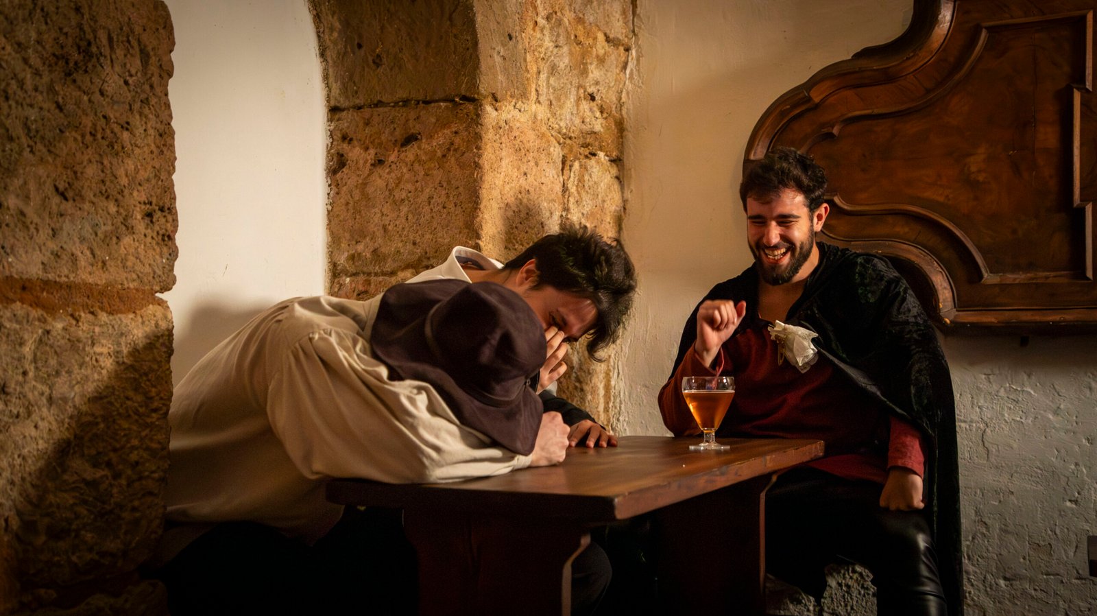 Los murmullos de los habitantes de la ciudad se pierden entre el eco de risas y cánticos en esta taberna, un refugio temporal para aquellos que desafían los temores que trae consigo esta noche.